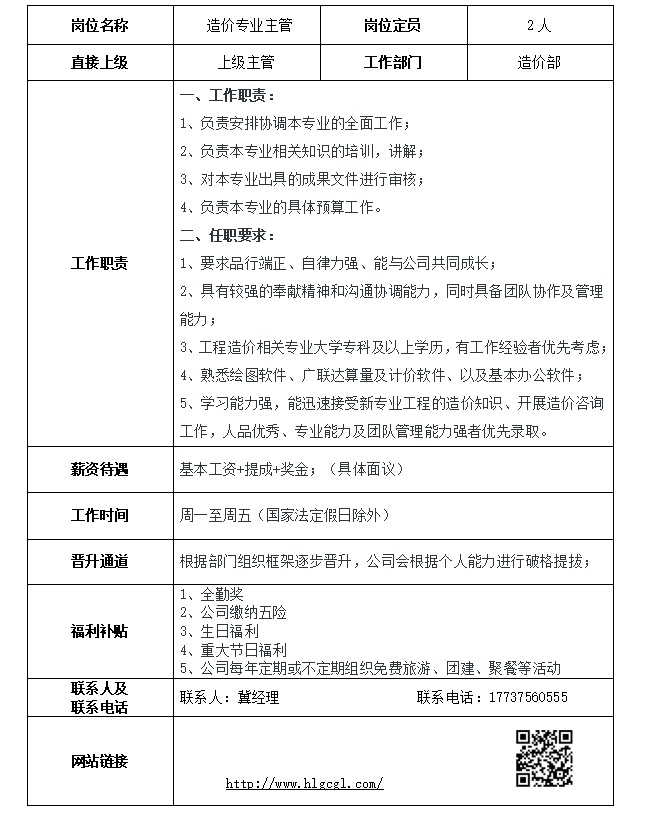 | 職位名稱: | 造價(jià)專業(yè)主管 | 應(yīng)聘此崗位 | |